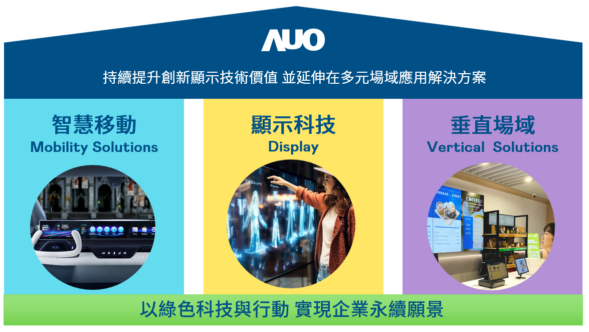 我們持續推動「雙軸轉型」,在精進顯示技術附加價值(Go Premium),與深化垂直市場應用(Go Vertical)的策略下,對應尊龙凯龙时官网进入的優勢競爭力與趨勢,我們奠定顯示技術、智慧移動、垂直場域三大永續營運支柱,在顯示技術領域的根基之上,延伸布局多元場域應用解決方案。將先進顯示科技助力智慧移動及垂直場域發展,並以綠色科技與行動為實踐,在轉型之路上貫徹永續經營之願景。